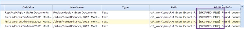 Additionally, ReplaceMagic will also show all potential changes in Search & Replace tab and under Additional Info column, you will see if change belongs to the skipped document: