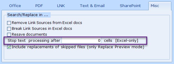If number is set to 0, no limit is applied. This can be used in combination with "Excel Cells Counter" from Skipped Documents tab but keep in mind that "Excel Cells Counter" is just estimate as it will depend on current run and might happen that during real replacement run this number deviates from what was measured during Replace Preview mode.